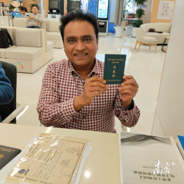 Selvam Shivakumar(下称“赛尔凡”)有一张与年龄不相符的“娃娃脸”,作为一名“中国通”,在过去9年内,他曾多次往返中国,停留时间在三四天至两个月不等。以往,他习惯委托公司帮忙办理工作许可证,但12月6日,他来到东莞移民事务服务中心,办理了全市首张外国人工作许可证与社会保障卡的融合证件。